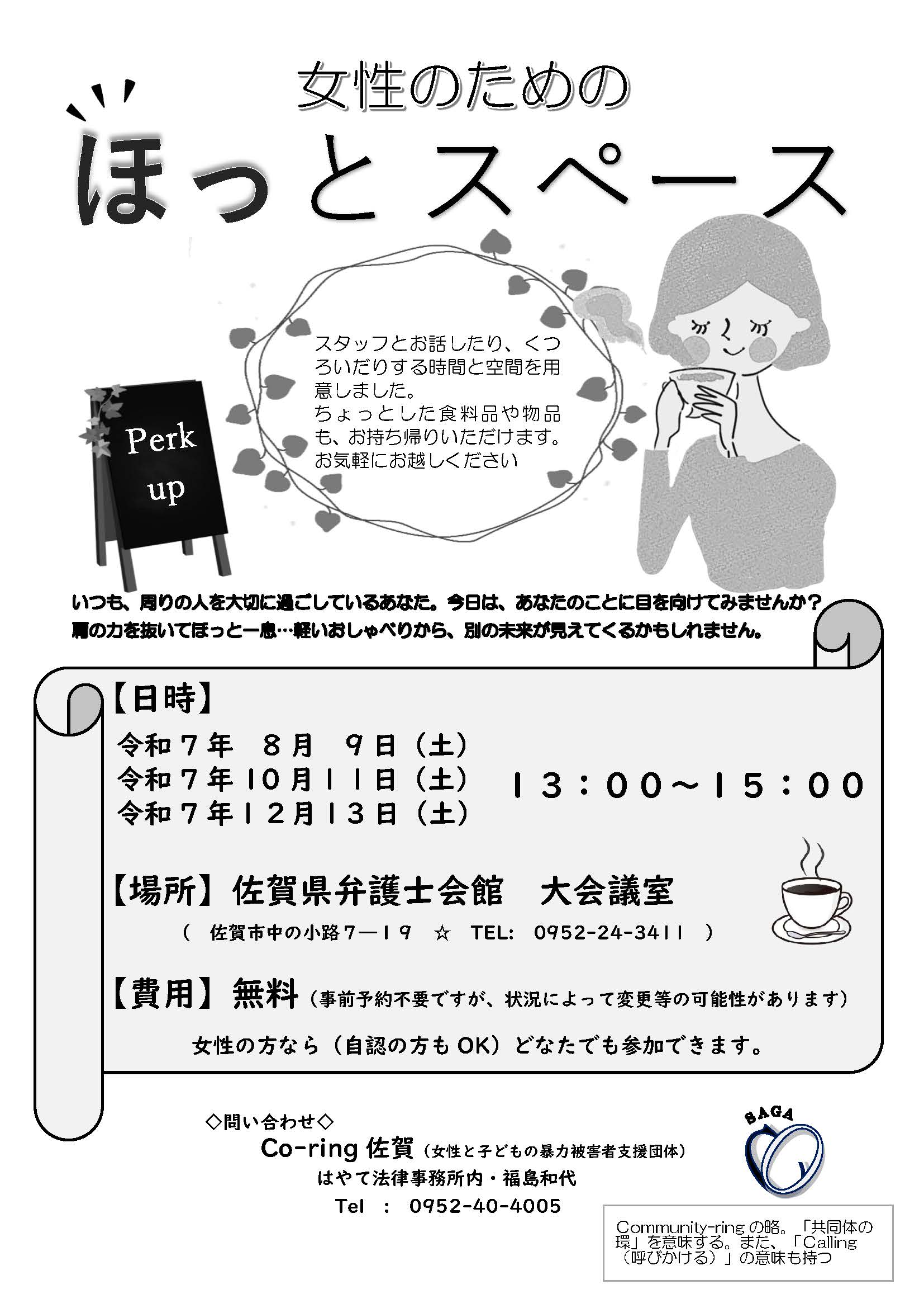 当事務所の弁護士福島和代が所属しておりますCo-ring佐賀(女性と子ども暴力被害者支援団体)が、4月13日(土曜日)に佐賀県弁護士会館大会議室にて、「女性のためのほっとスペース」を開催いたします。